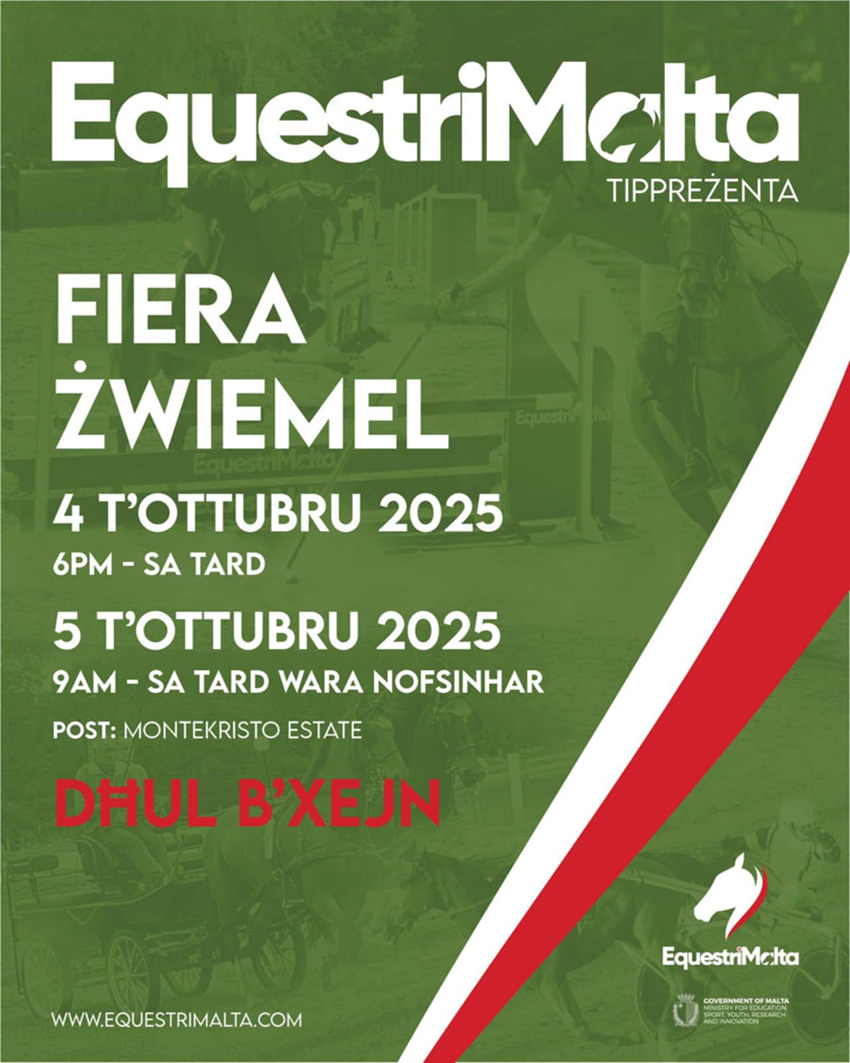 Għall-ewwel darba, EquestriMalta – l-awtorità regolatorja li tappoġġja l-isport kollu taż-żwiemel – se tkun qed ittella’ ‘Fiera Żwiemel’. L-avveniment se jsir ġewwa l-MonteKristo, is-Sibt 4 ta’ Ottubru mis-6pm ’il quddiem, u l-Ħadd 5 ta’ Ottubru mid-9am sa wara nofsinhar. Id-dħul għall-fiera huwa b’xejn u mistennija tattira konkorrenza sabiħa.
