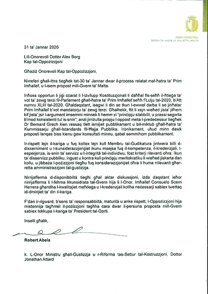 Il-Prim Ministru Robert Abela bagħat ittra oħra lill-Kap tal-Oppożizzjoni biex jieħu pożizzjoni ċara dwar il-kariga ta’ Prim Imħallef.