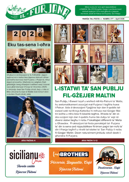 Min jixtieq jakkwista kopja tal-ħarġa ta’ April tal-gazzetta ‘IL-FURJANA’, jista’ jċempel fuq in-numri 79339649 jew 99821494, jew jikteb fuq l-indirizzi elettroniċi [email protected] jew [email protected]. L-indirizz postali hu ‘IL-FURJANA’, 44 Triq il-Kapuċċini l-Furjana FRN 1033.