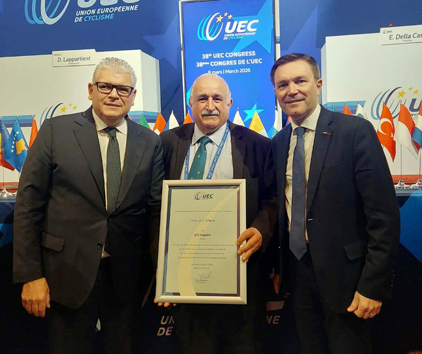 Avignon, Franza – 8 ta’ Marzu 2026 – Joe Bajada, is-Segretarju Ġenerali tal-Federazzjoni Maltija taċ-Ċikliżmu, ingħata l-prestiġjuż UEC Merit Award mill-Union Européenne de Cyclisme (UEC) bħala rikonoxximent għall-impenn u s-servizz twil tiegħu lejn iċ-ċikliżmu f’Malta u fl-Ewropa.