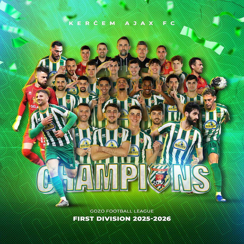 Kercem Ajax ġew inkurunati Champions tal-Ewwel Diviżjoni tal-BOV Gozo Football League wara li għelbu lil Nadur Youngsters bl-iskor minimu ta’ 1-0 fil-Gozo Stadium nhar it-Tnejn filgħaxija.