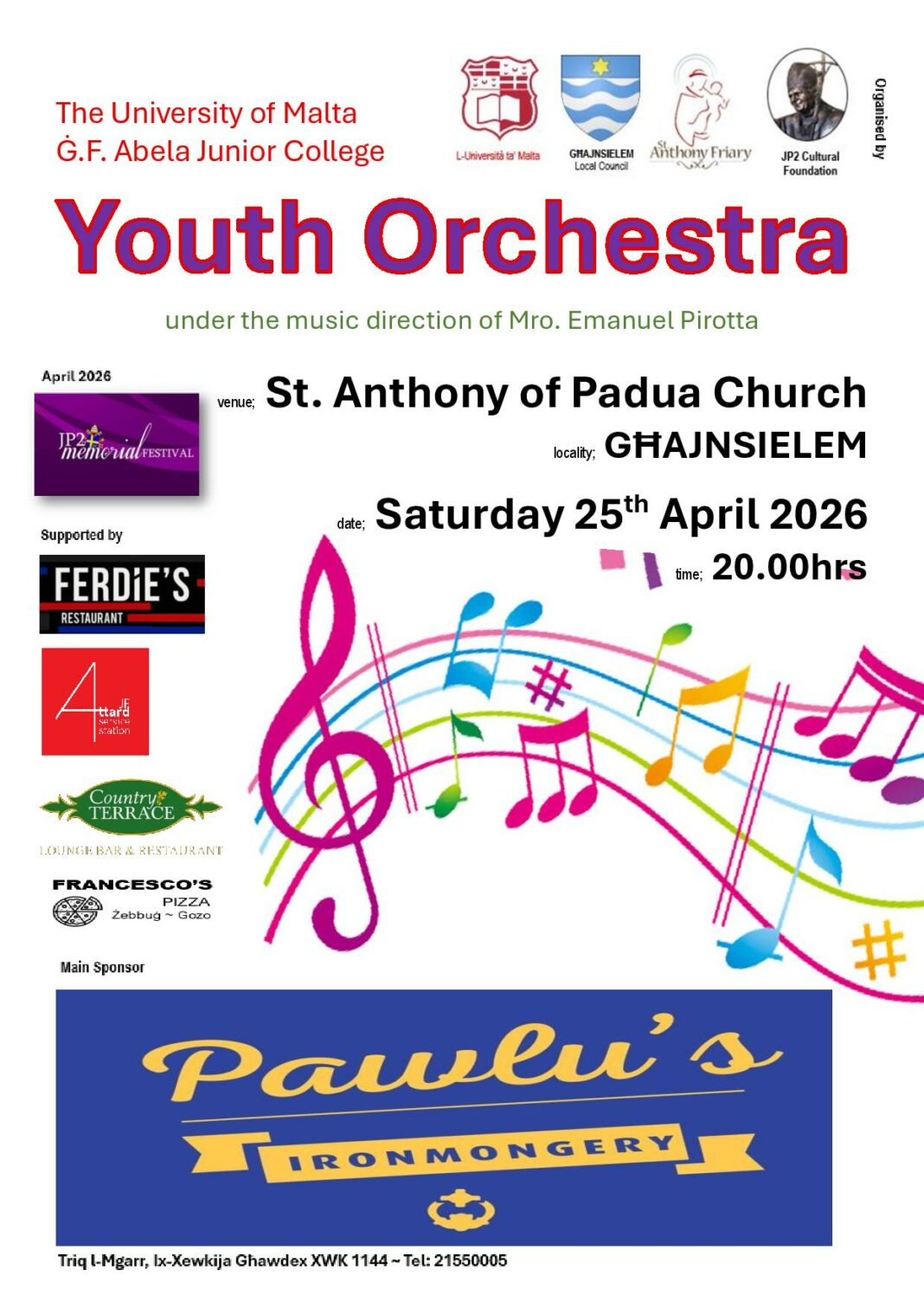 Il-festival ta’ memorjali magħruf bħala il- “JP2 Memorial Festival 2026” organizzat mill-Fondazzjoni Kulturali Papa San Ġwanni Pawlu II, għax-xahar ta’ April se jospita l-Orkestra taż-Żgħażagħ tal-Università ta’ Malta, Ġ.F. Abela Junior College taħt id-direzzjoni mużikali ta’ Mro. Emanuel Pirotta f’kunċert ser issir fil-Knisja ta’ Sant’Antnin ta’ Padova f’Għajnsielem nhar is-Sibt, 25 ta’ April 2026 li jibda fit-8.00pm, immedjatament wara li jintemm is-servizz tal-Knisja.