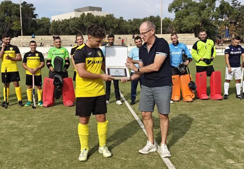 Il-president tal-Malta Hockey Association David Agius ippreżenta l-unur ta’ plejer tas-sena lill-istess Luke Bajada.