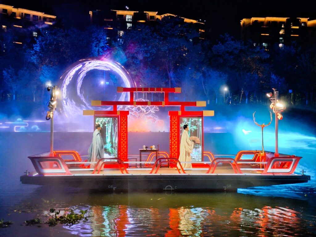 Filgħaxija rkibna dgħajsa kbira moderna li ħaditna għall-Baiyun Lake Night Cruise fejn stajna naraw spettaklu ta’ drama, mużika, dawl u effetti fuq l-ilma matul vjaġġ ta’ siegħa. Bħala parti mill-avveniment, kien hemm dgħajsa ċkejkna tradizzjonali b’żewġ atturi fuqha li kienu qed jirrakkuntaw parti mill-istorja ta’ Suizhou filwaqt li jsalpaw magħna fuq l-ilma tal-lag.